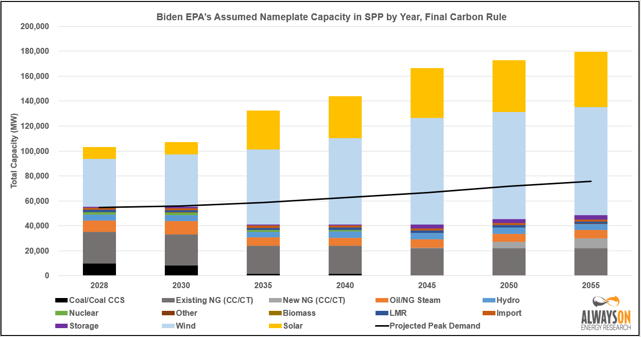 For example, the graph below shows the generation mix for SPP in each of the EPA test years (2028, 2030, 2035, 2040, 2045, 2050, and 2055). As you can see, EPA’s modeled SPP grid would need approximately 20 GW of wind or solar capacity at any given moment to meet projected peak demand, meaning SPP would not be able to weather an evening without wind.