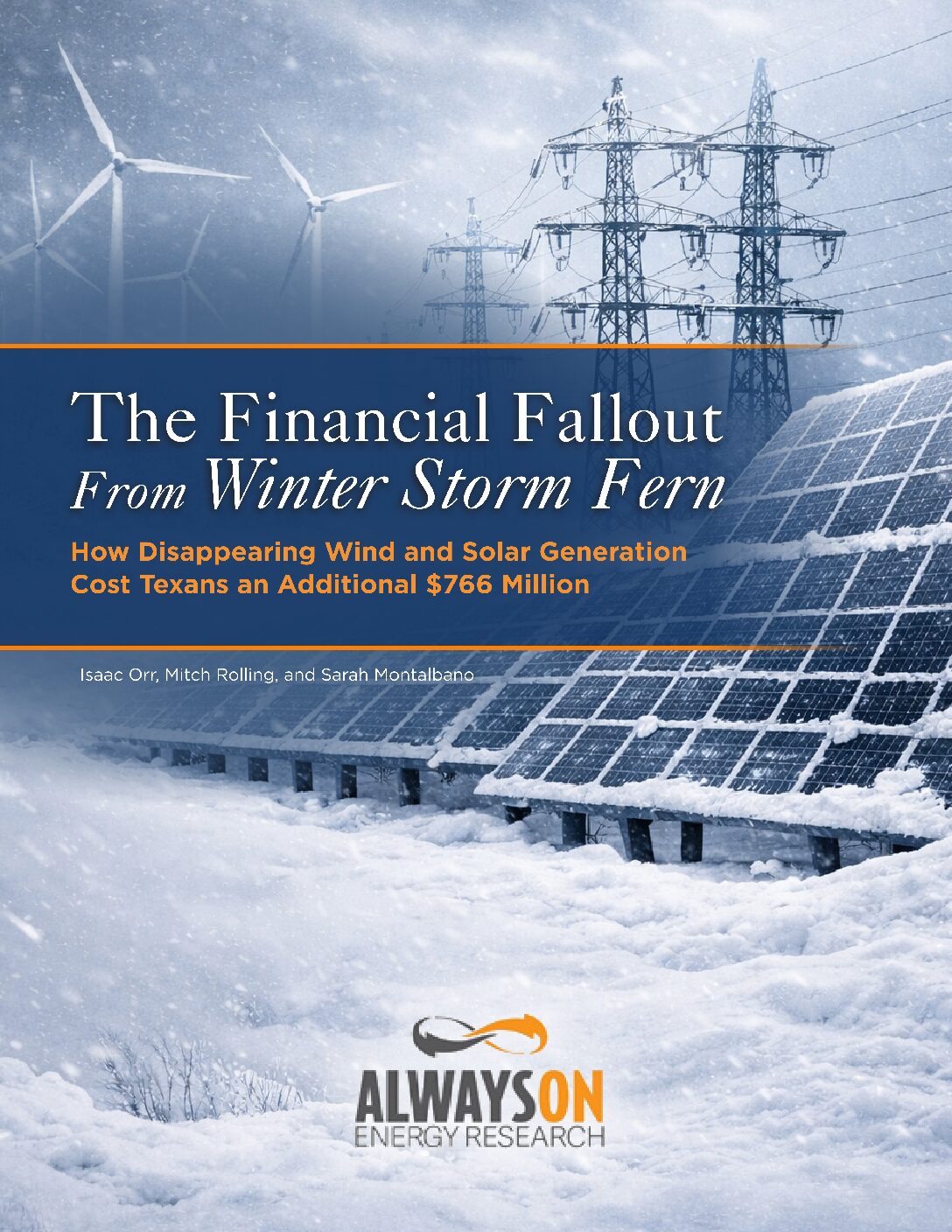 Disappearing wind and solar cost Texans an additional $766 million in just 17 hours during Winter Storm Fern. The Electric Reliability Council of Texas (ERCOT) Region has increasingly relied on weather-dependent resources, with no net dispatchable capacity added to the grid since 2003.